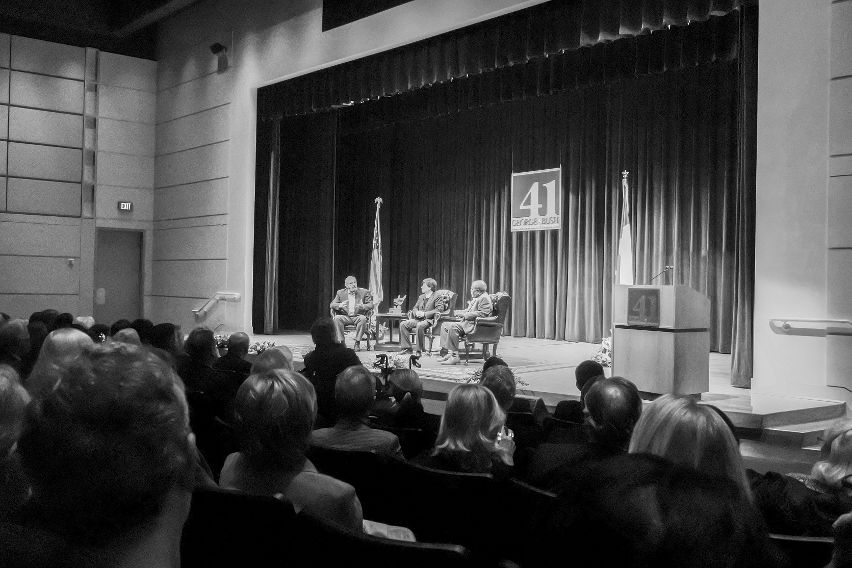 The students got a closer view of the seventy-year marriage of George and Barbara Bush hours later, when they sat about 20 feet from the couple for a presentation by Ken Burns and Mark Burns, who came to the Bush Library to discuss the 100th Anniversary of the national park system.