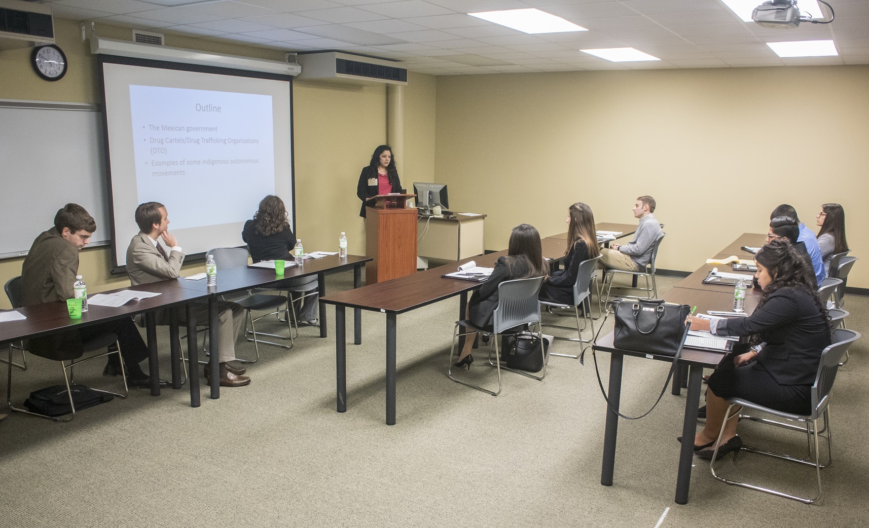 At the conference our very own Professor Yawn served as a discussant for the Undergraduate Research on Public Policy panel and later presented his own research. We were also excited to be there to support our fellow LEAP Ambassador Megan Chapa, who would later present her research paper on “Maquiladoras, NAFTA and their Consequences.” Upon our arrival we were graciously welcomed by Dr. Strong and the staff of the University of Arkansas at Monticello, then made our way quickly to the room where Professor Yawn’s panel discussion would be. The panel room was a cozy fit, much like any classroom you would find on campus at Sam Houston. This made the presentations of the research engaging and a personal. Subjects of the research ranged from the cyber security in the United States by Shannon Abbott…
