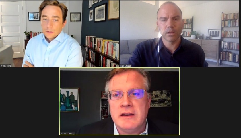 What struck Rhodes, as he reflected and traveled and reflected some more, is how parts of the world were “turning to nationalism and authoritarianism,” particularly Hungary, Russia, China, and the United States. Key to this period, according to Rhodes, was the great recession of 2008, which is “when the narrative of liberalism and democracy collapsed.” With this narrative, Osnos readily and frequently agreed.