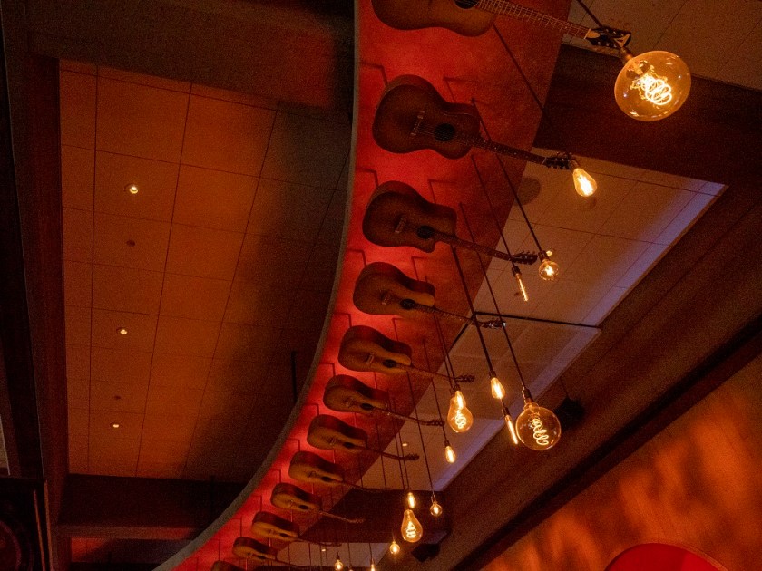 Walking through the entrance of the auditorium, we saw country decor everywhere–including the ceiling, which had $90,000 Gibson guitars floating above us.