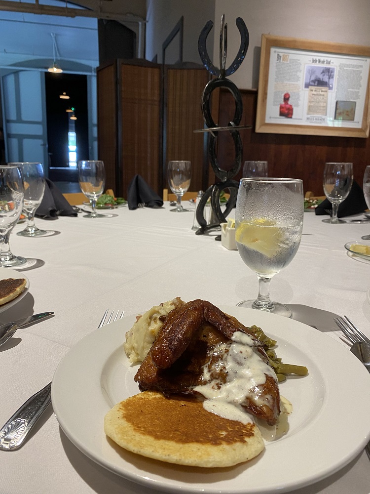 The inside of the grand carriage house has been redesigned into a nice, neat country styled kitchen and dining area where we were greeted with servers and had a wonderful three-course meal. Our appetizer was a salad that consisted of spinach leaves garnished with berries, walnuts, goat cheese, and topped off with a balsamic dressing. The entrée was a plate of chicken, green beans, red skin mashed potato, and a corn-flour pancake.