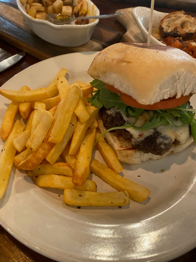 The menu has many options: salads, pasta, steaks, burgers, and much more. Thus, we had to take a closer look to see what appealed most to us. For starters, we got the Bruschetta Neapolitan, Garlic Crostini (toasted bread) topped with flame seared tomato, basil, and with a balsamic vinegar drizzle and parmesan cheese, and Patatas a la Brava, red potato cubed fries with an aioli sauce.