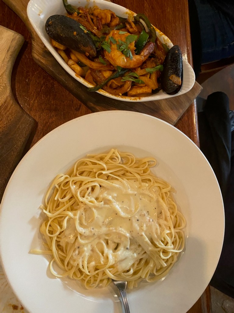 Ultimately, Yvette and I ordered the Sam’s Secret Burger, Professor Yawn the Fettuccine Alfredo, and Ms. Stephanie got a seafood platter.
