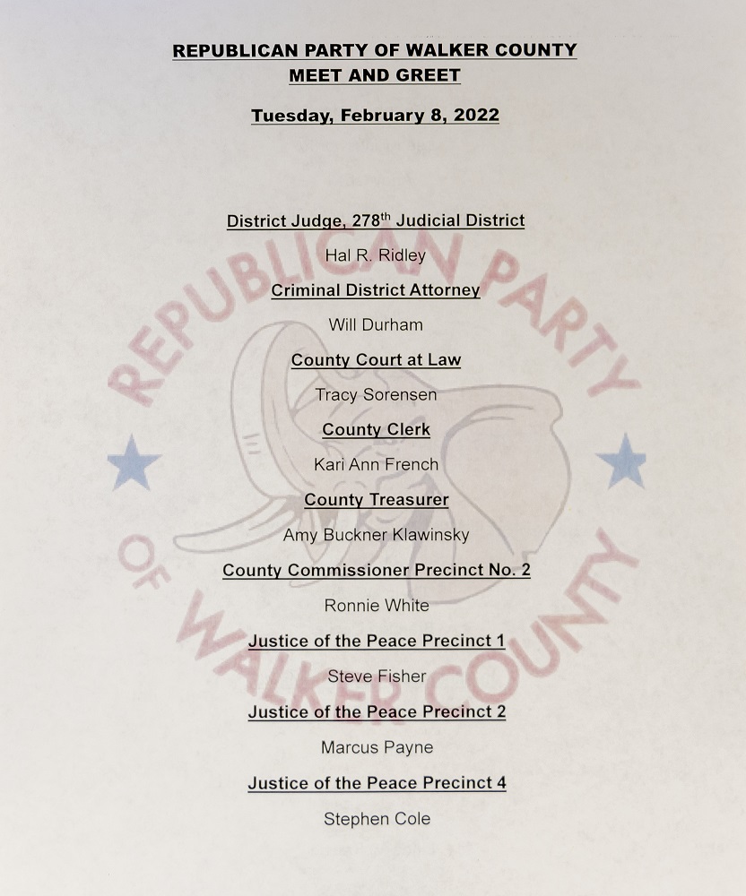 On Tuesday, February 8, 2022, the Walker County Republican Party hosted a Meet and Greet for the upcoming March 1 primary election. Members from the community were able to hear from most of the Candidates who are running.