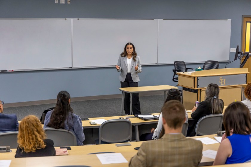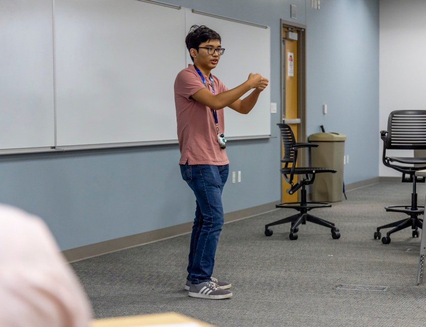 In a first for the Pre-Law Society, there was a tie! Since we have no precedent or rule for how to guide such a scenario, we had to decide on the spot. The class–and the candidates–opted for another set of speeches. First was Emily Albright…