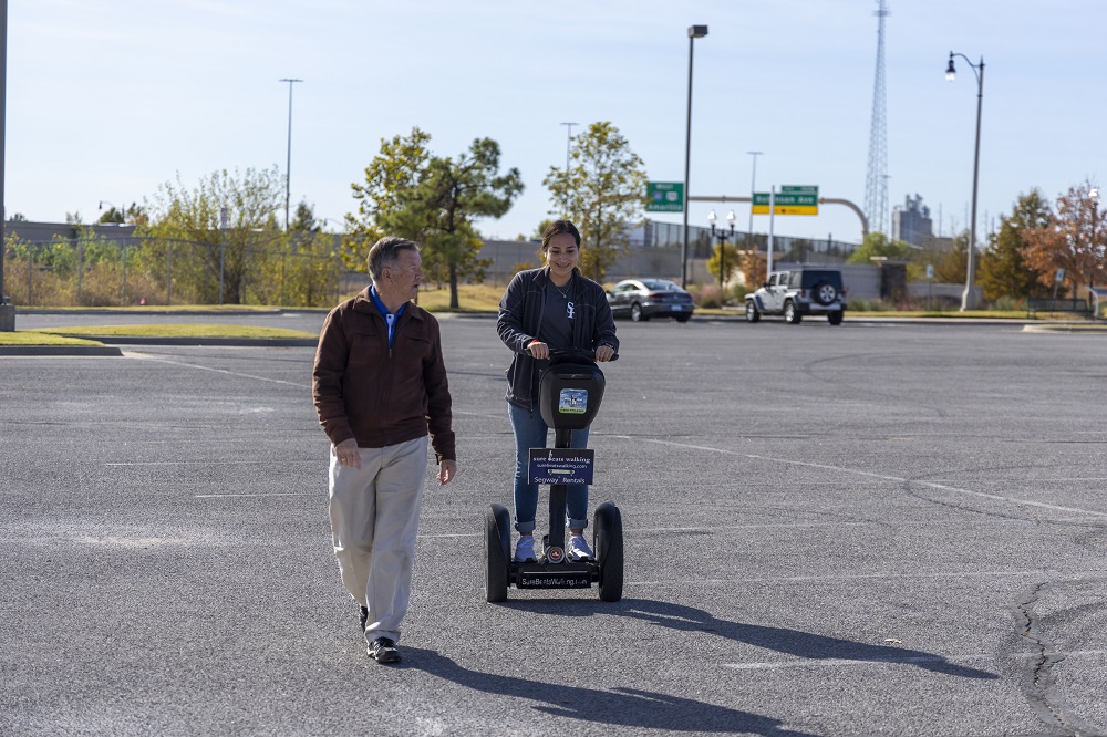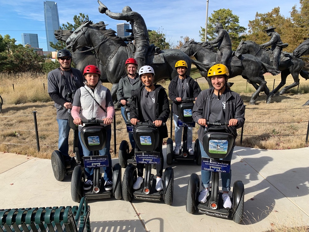 To conclude our trip for Oklahoma, the LEAP members attended a Segway tour! Our instructor Mr. Skip, began with refreshment courses for Yvette since she had already ridden a Segway. For Morgan, Erin and me Mr. Skip taught us how to move the Segway using our bodies by leaning forward and stopping by leaning back and keeping the Segway upright.