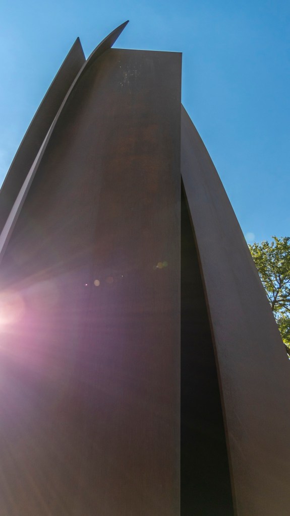 On the museum grounds, we were introduced to a new (to us) artist, Richard Serra, known for his massive bronze sculptures. His abstract works develop a “patina” over time, meaning that the metal changes color. Since its creation in 2002, we could clearly see how the coloring of Vortex has changed over time.