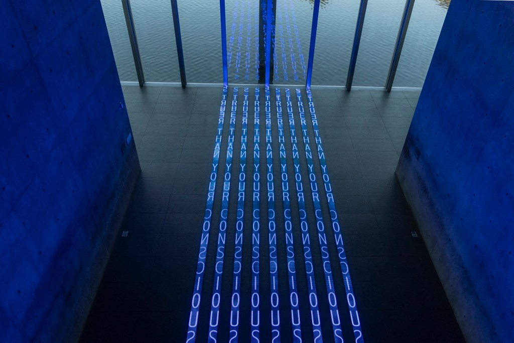 True to the nature of modern art, the pieces were not limited to paint and canvas. Steel and fiberglass adorned the center of one gallery, while interesting messages displayed on LED signs followed a vertical and uniform pattern in another. Of particular interest were Nancy Graves’ Inside-Outside and Jenny Holzer’s Kind of Blue, which we spent a lot of time on, pondering and (trying to) photograph.