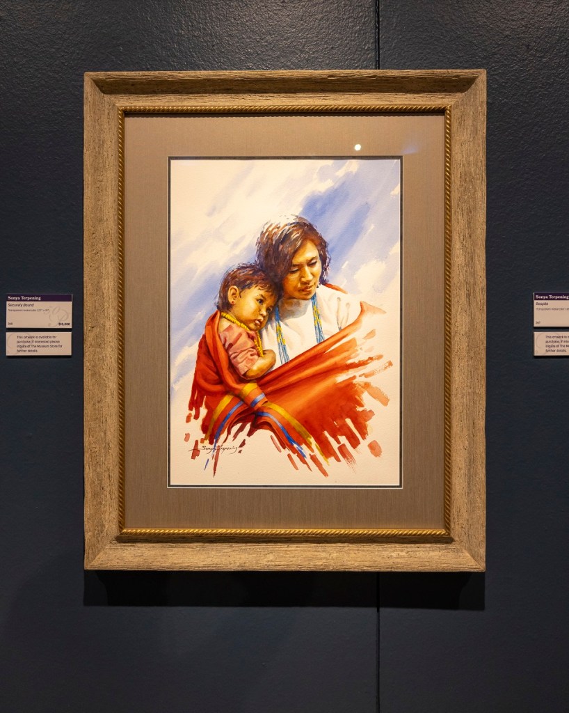While most followed similar Western themes, some were vastly different in terms of color or composition. I loved a vibrant water-colored painting of a Native American mother and child painted by Sonya Terpening, titled Securely Bound.