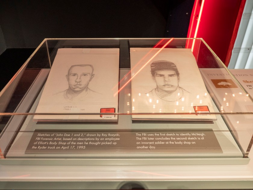 Along with the chaos and confusion of rescue efforts, police and other law enforcement had to shift focus to finding the cause of the bombing. The museum exhibits display this well, too, with many evidence artifacts: original police sketches of Timothy McVeigh and Terry Nichols;