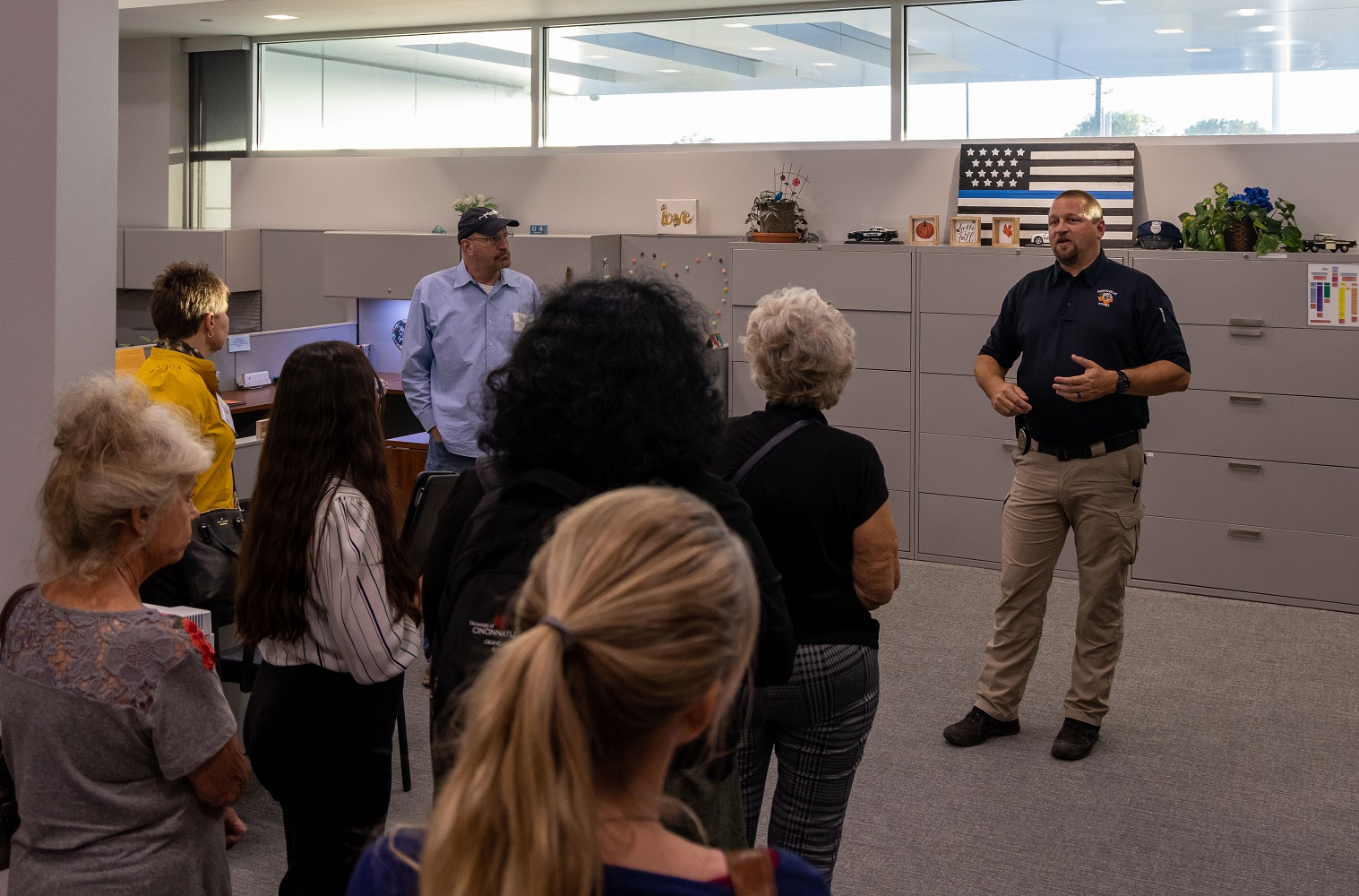 We had the opportunity to see the officers’ offices, computer spaces, and interview rooms. In a bullpen area with lots of open space and computers, we met a rookie who was enjoying (or not) filling out paperwork.