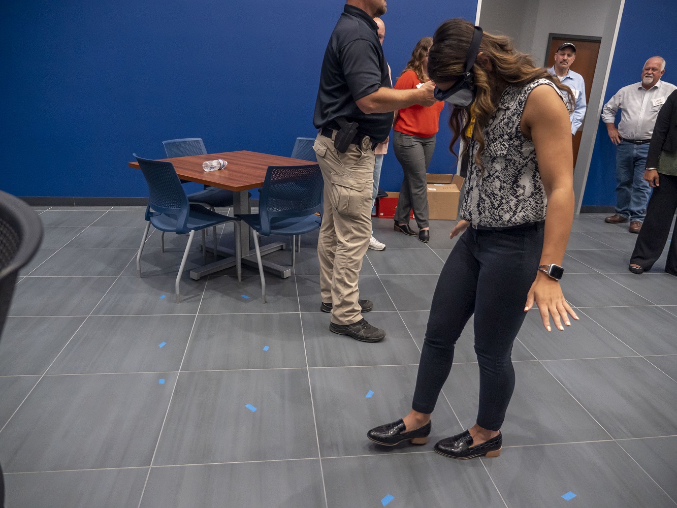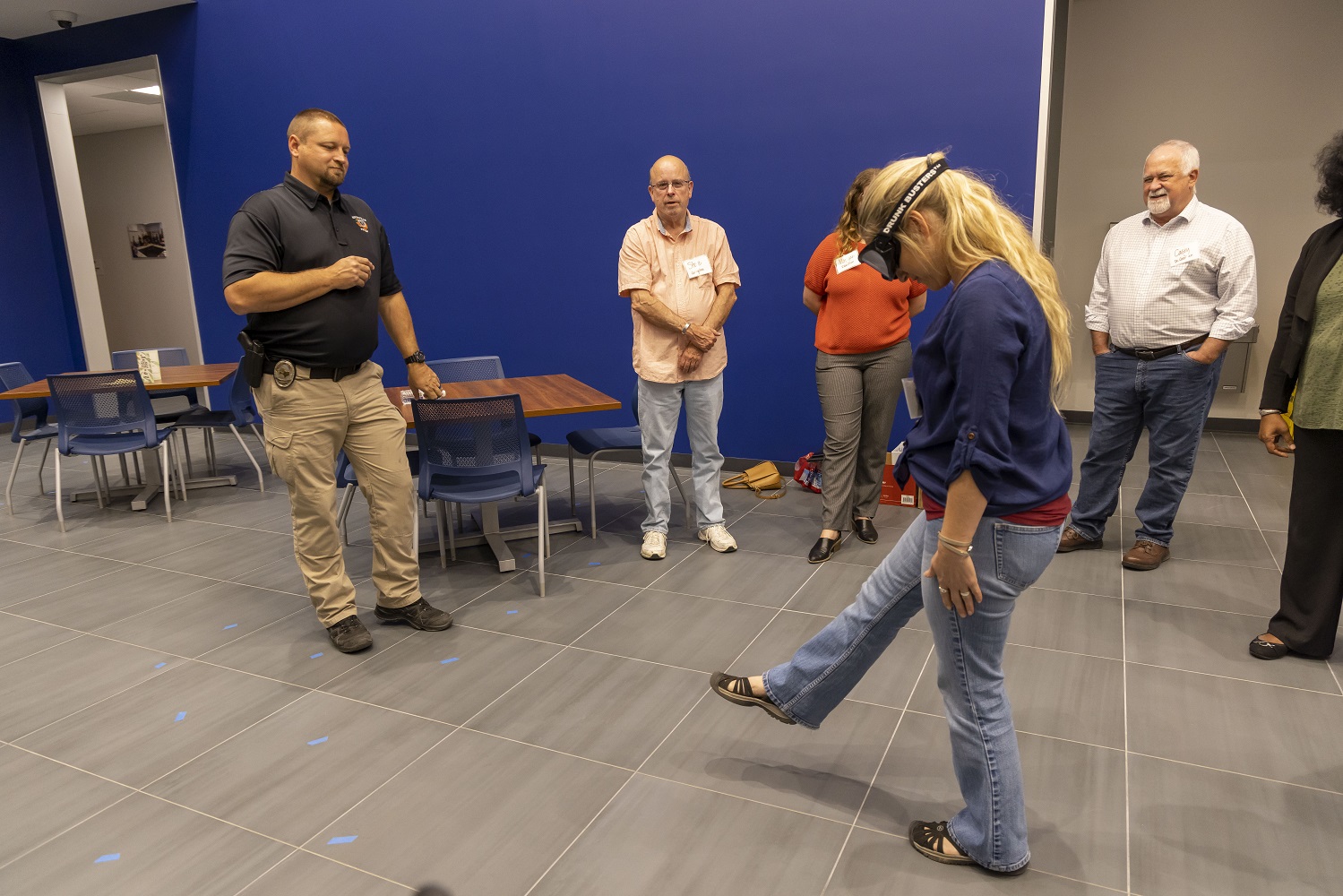 Corporal Warner provided us with a demonstration of what is done during a sobriety test. In particular, he spun us around and then conducted a “nystagmus” test, which is one of the key indicators of sobriety or the lack thereof. Jazmin Palacios, a Ph.D. student at SHSU, was voluntold to participate, and she not only did this test, but also wore the “drunk goggles” provided while doing a field sobriety test.