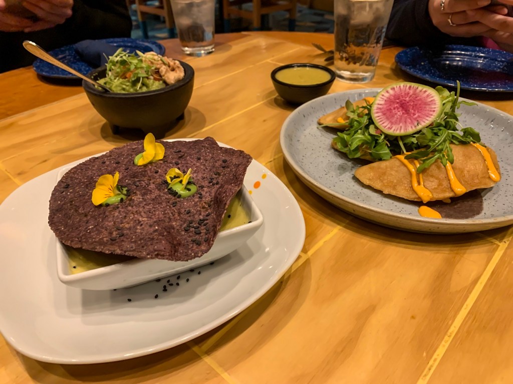 Prior to the musical, we had dinner at La Fisheria, which provided a new experience with food. Olivia had the salad; Daniela had the fish; Michelle had a type of ceviche, with shrimp, scallops, and peppers; Professor Yawn and Stephanie split the tacos (fish and lobster). In addition, we all split some appetizers: poblano dip, empanadas, and guacamole.