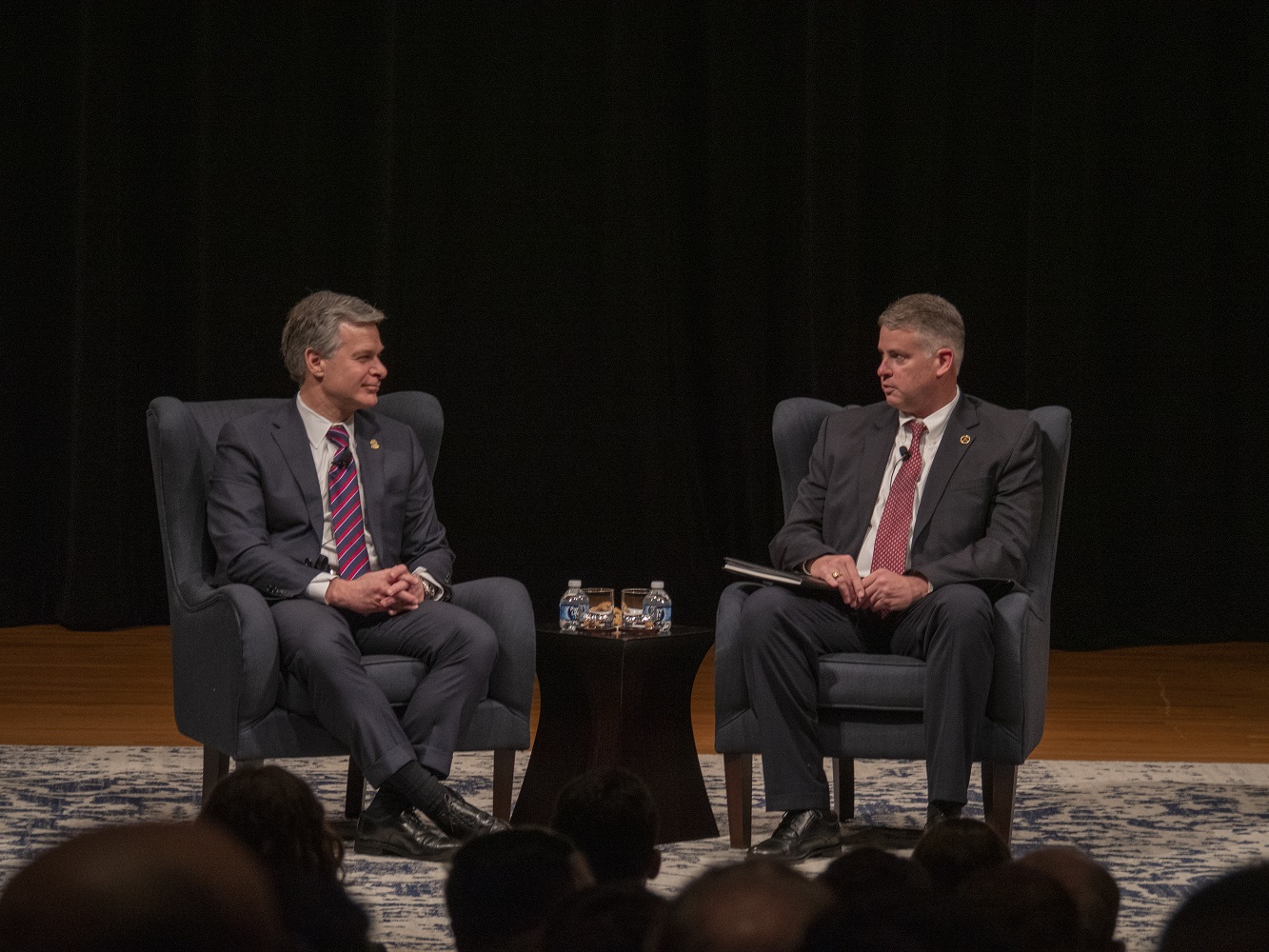 Following a full day of hearing court cases on SHSU’s campus, LEAP students moved their roving classroom to TAMU’s Bush School, where they attended a presentation by FBI Director Chris Wray, a program sponsored jointly by the World Affairs Council and the Bush School at TAMU.