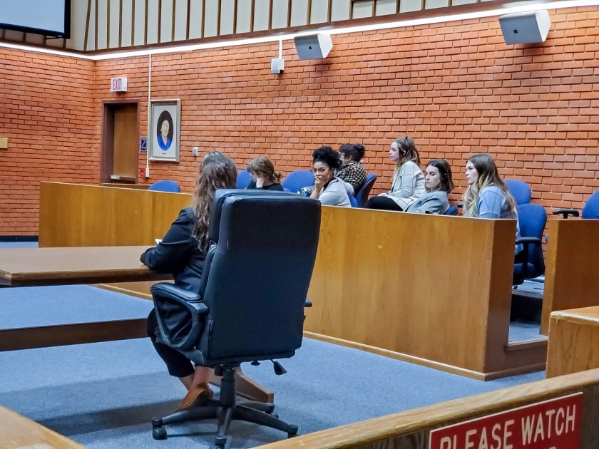 The process continued with the second simulated hearing in which Alison Concannon was the expert witness and Inneke Vargas handled the direct exam. At the last hearing, the expert witness was Kennedy Anderson, and Sarah Hernandez asked the questions on direct exam. The other three students in the Forensics Psychology course, Brianna Davis, Kayla Spenard, and Aislinn Tansey, will participate in a future simulated hearing.