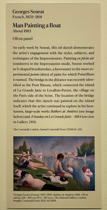 In one of the featured exhibits, Van Gogh and the Avant-Garde: The Modern Landscape, they featured the studies of Sunday on La Grande Jatte, amongst other impressionist works. This is where I was lucky to see the different versions of the sketches and the number of changes they underwent for the final version. Although Seurat’s style departs somewhat from impressionism, I did particularly like this painting after I saw how it all came together.