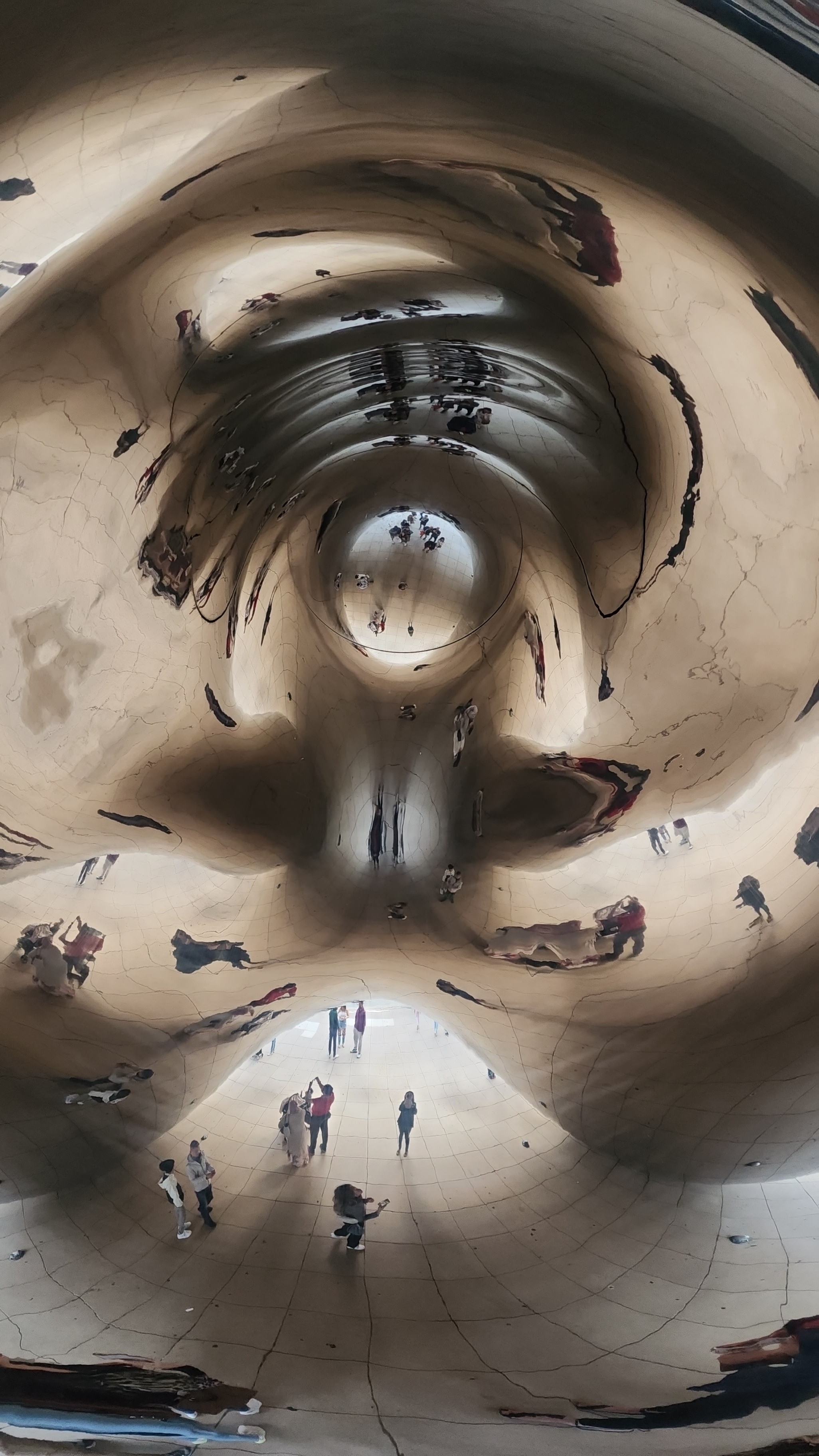 BUT . . .however long I spent in the Museum, I had to make time for at least one sculpture outside the Museum: the Bean. Formally called “Cloud Gate,” this iconic sculpture by Anish Kapoor is one of Chicago’s key tourist attractions, and I confess I spent much time exploring its smooth, reflective surface, with selfie camera in hand!
