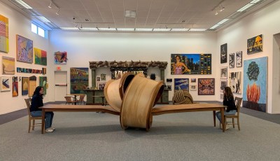 There were fun pieces, too. One artist made sharks that hung from the ceiling, which would have been terrifying, but they were made from golf bags and, in one case, a vacuum cleaner. Jason Richel’s work gravitated toward stackable food objects, including smores and toast. Moreover, as LEAP Ambassadors, we also tried to kill two birds with one stone (or, as we were taught in a training once, to “feed two birds with one scone”) by not only enjoying the art, but also by working on our communication skills. This was done by sitting at a special table designed to foster teambuilding…