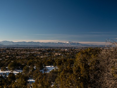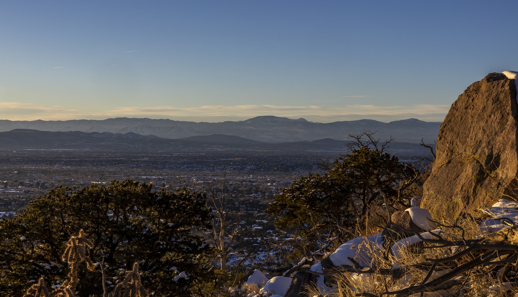 The trail wends its way up the mountain, offering periodic views of the community below, the mountains on the horizon, and the snow that had recently blanketed the area.