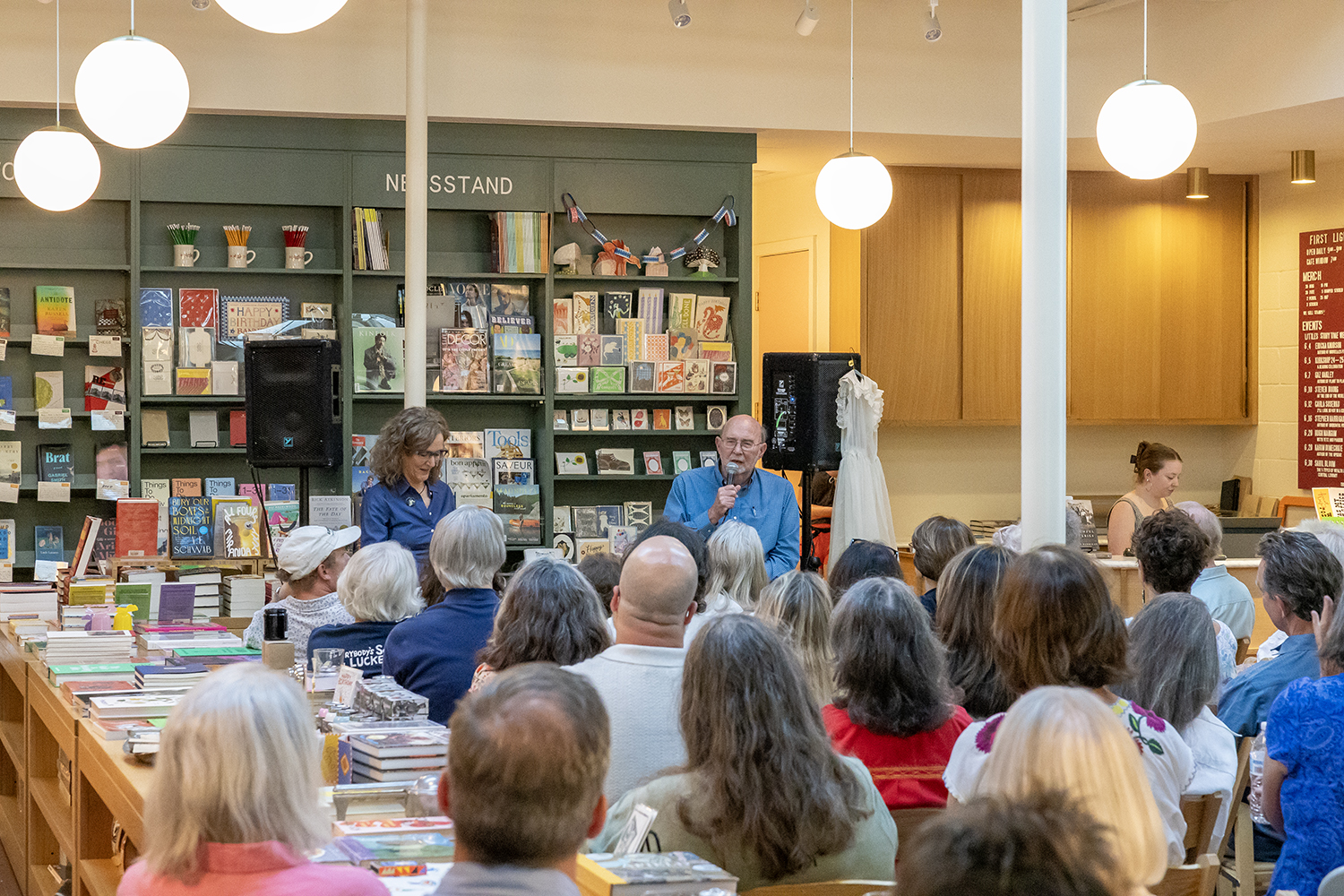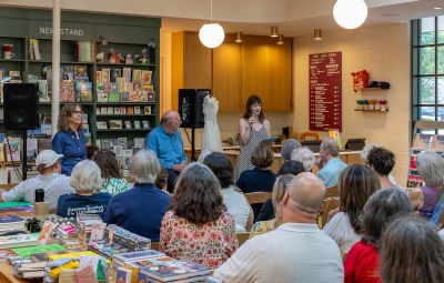 Mixed in were some discussions that were less relevant to the book. Bird asked not once but twice about the Catholic Church’s “shift to the right,” and she brought her confirmation dress to the event, and she hung it from a speaker at the front of the room.