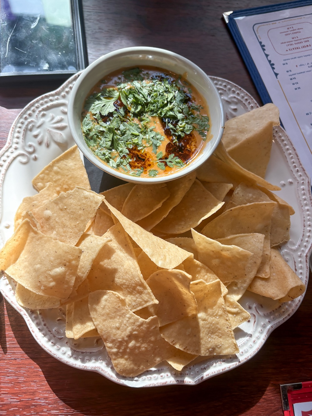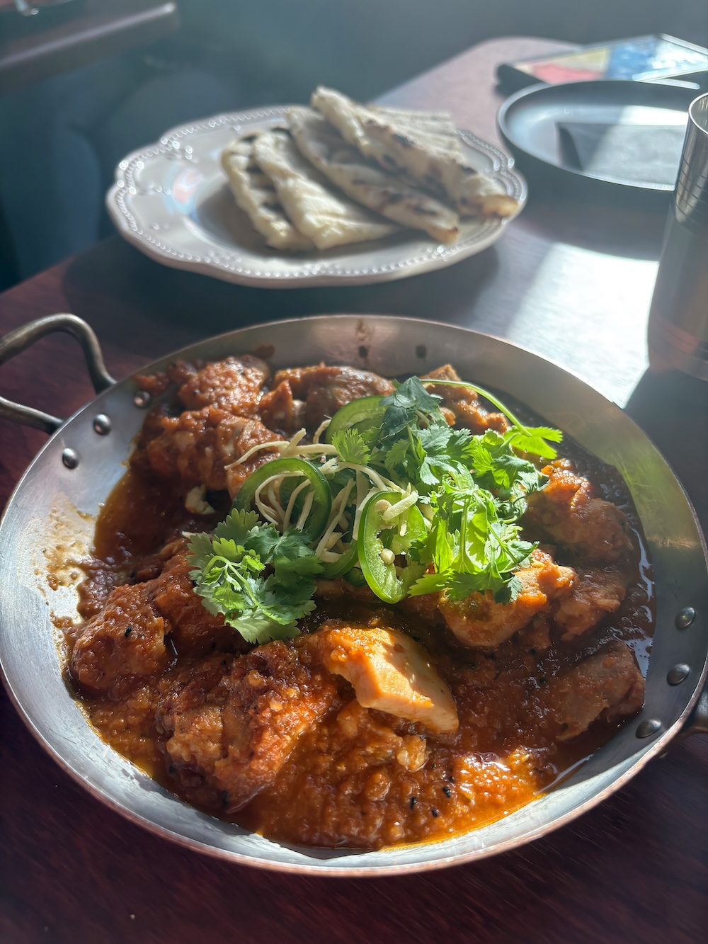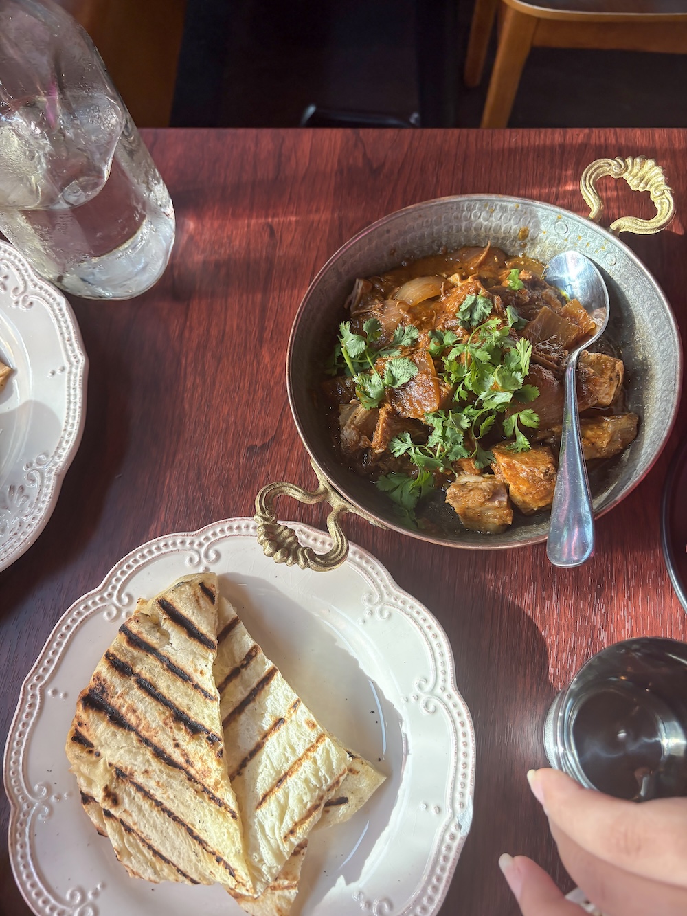 We started with the curry queso (which was excellent), and then I had the chicken tinga curry, Cinthia got the chicken masala, and Michelle went with the pork vindaloo. All of it was solid—definitely a fun place worth checking out.