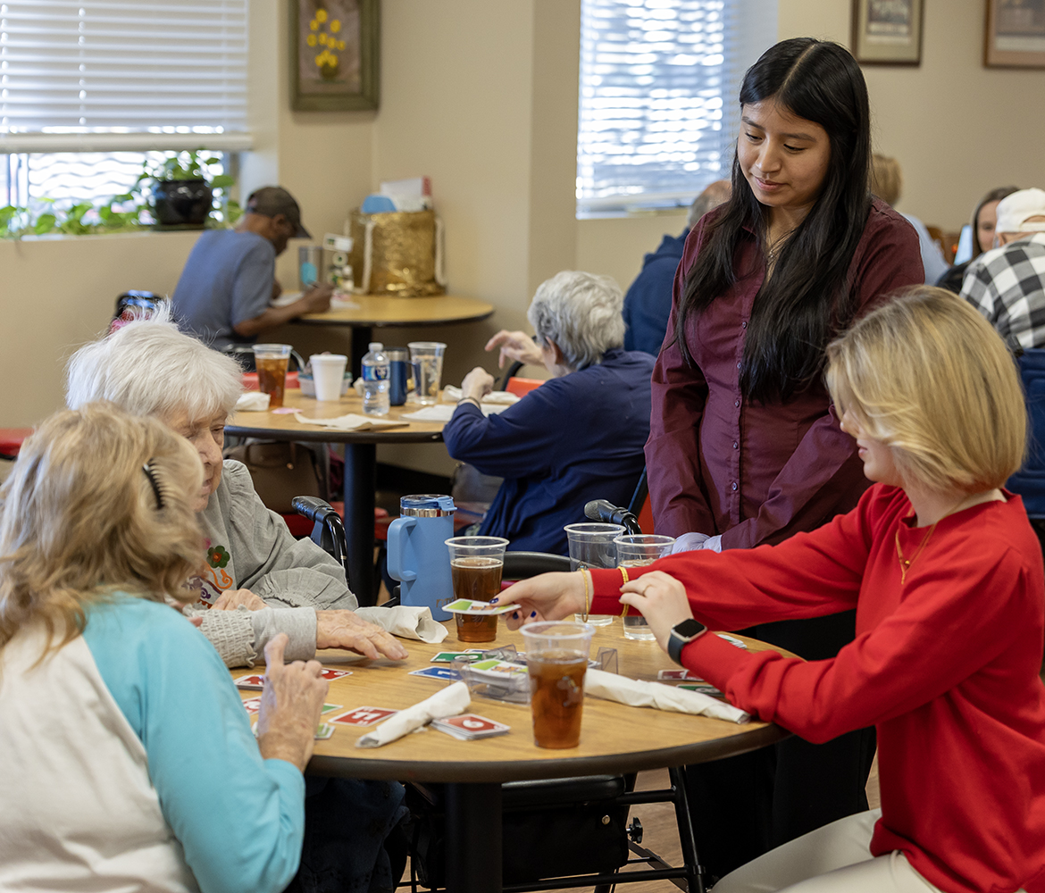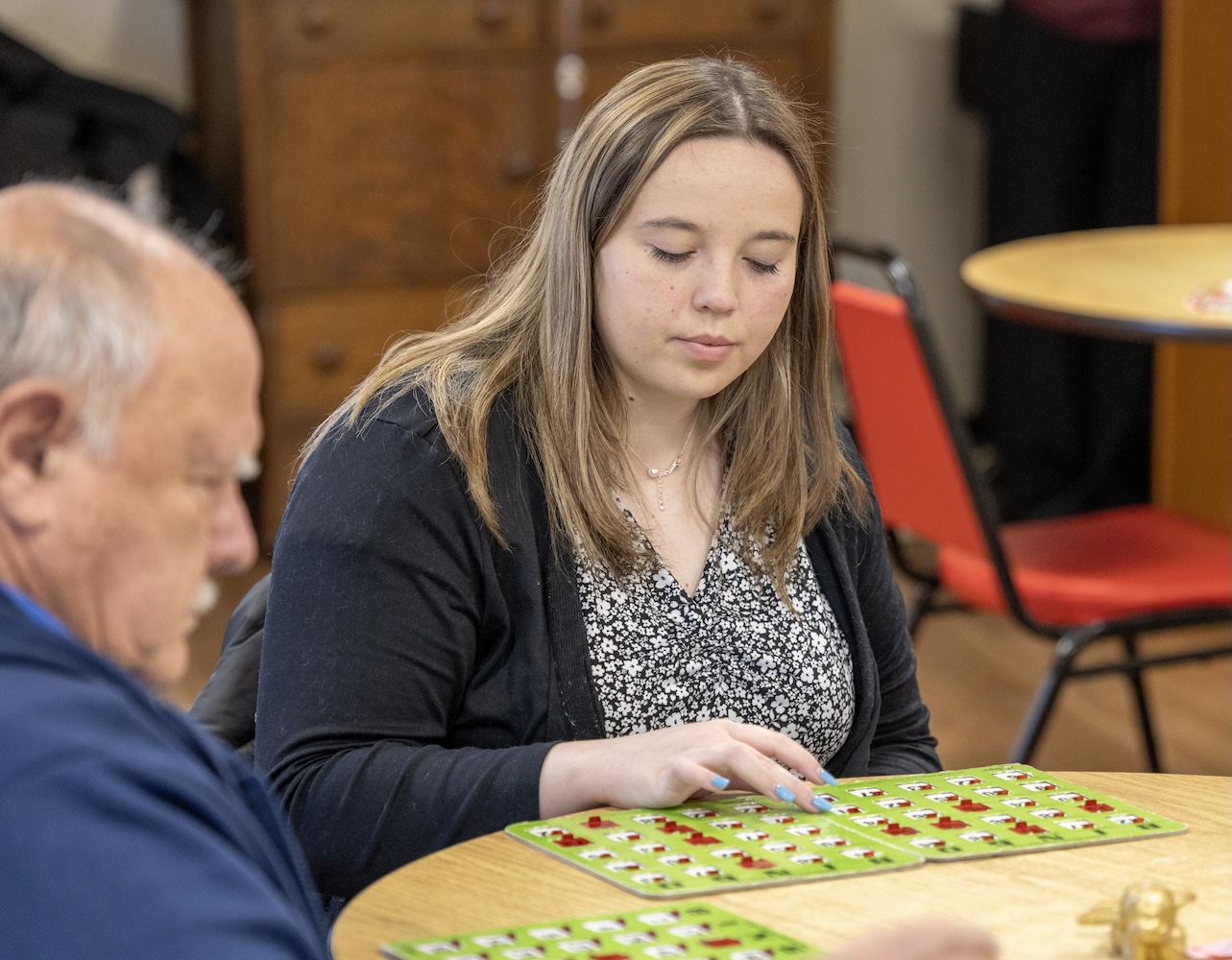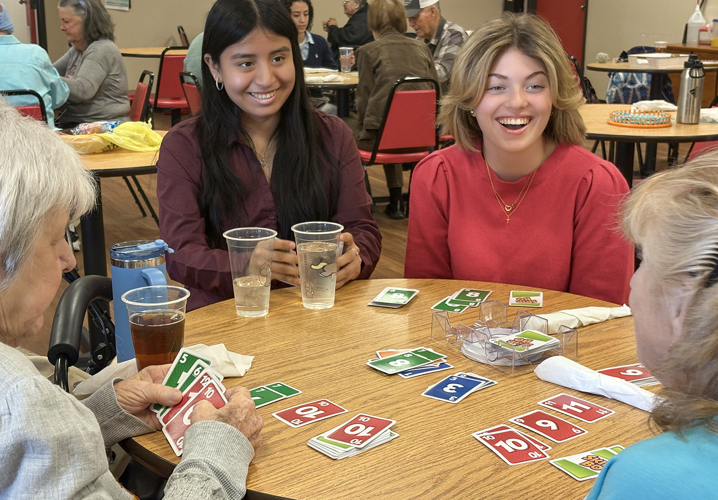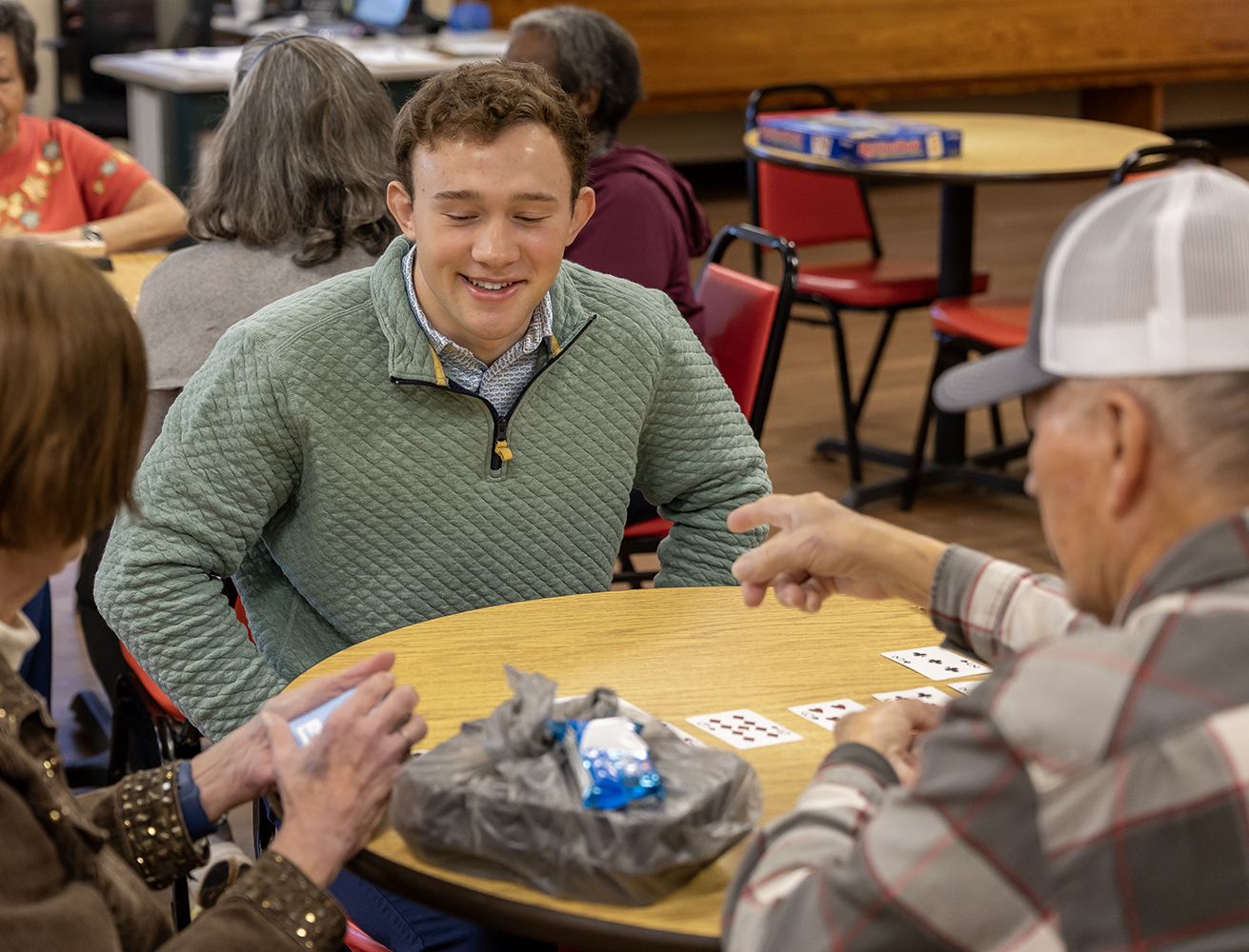 Following the Bingo game, students sat at different tables, interacting with seniors and other volunteers. In some cases, such as Ashton’s, it meant learning new card games from others at the table…