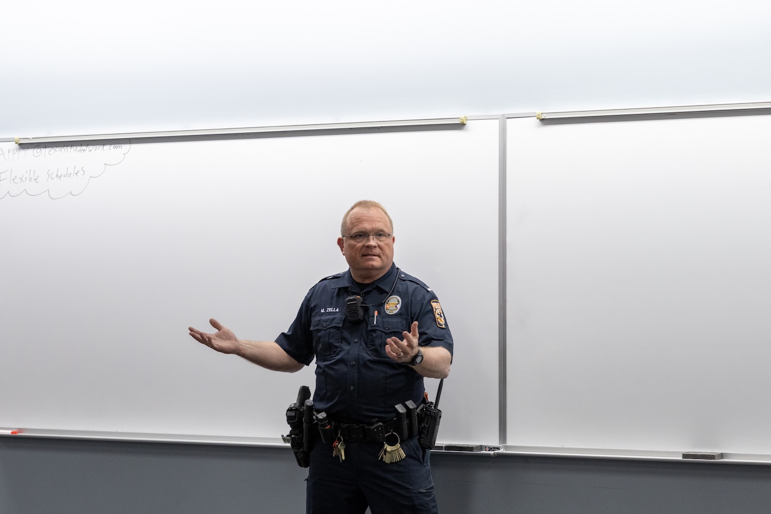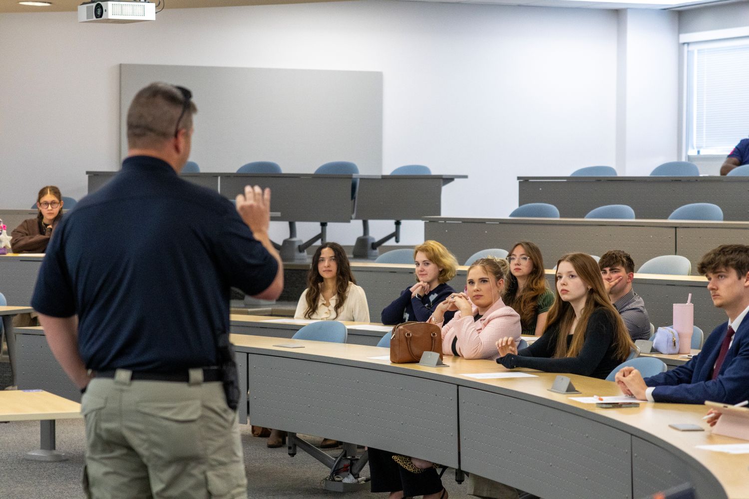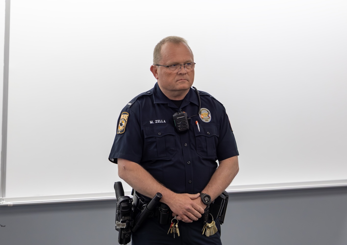 What made this meeting stand out was how interactive it was. Rather than talking at us, they walked us through real scenarios, ones that felt uncomfortably realistic. Two students acted out a situation at a house party: one over 21, one underage, a drink left unattended. At first, it seemed harmless. But as Butters and Zella broke it down, the legal implications became clear, showing how quickly a casual decision can turn into a charge. That theme carried throughout the night: small choices, real consequences.