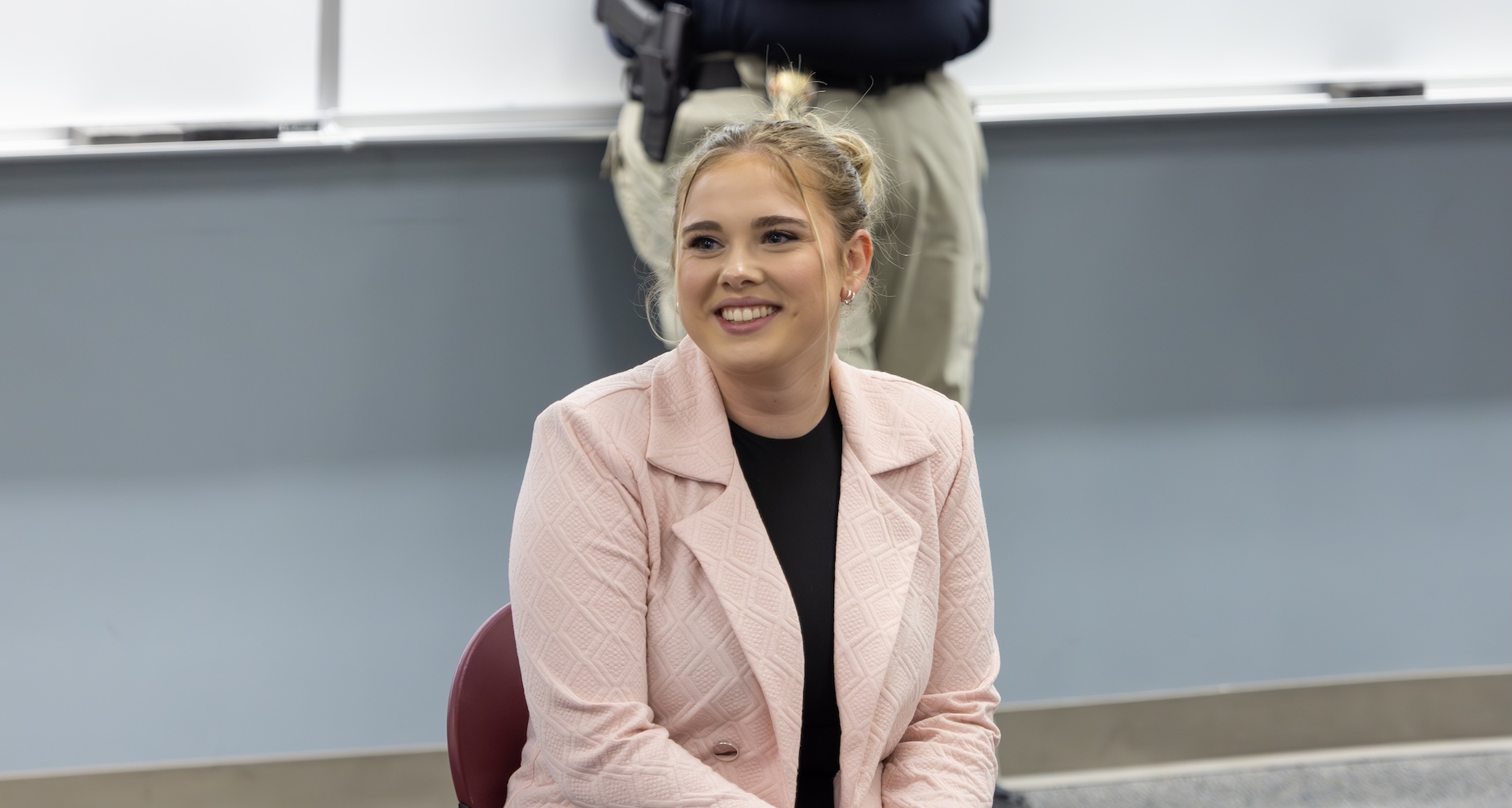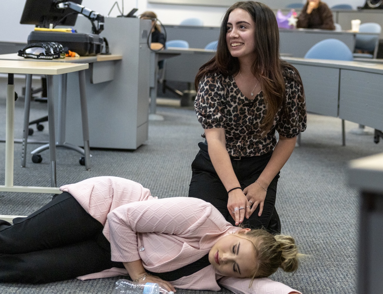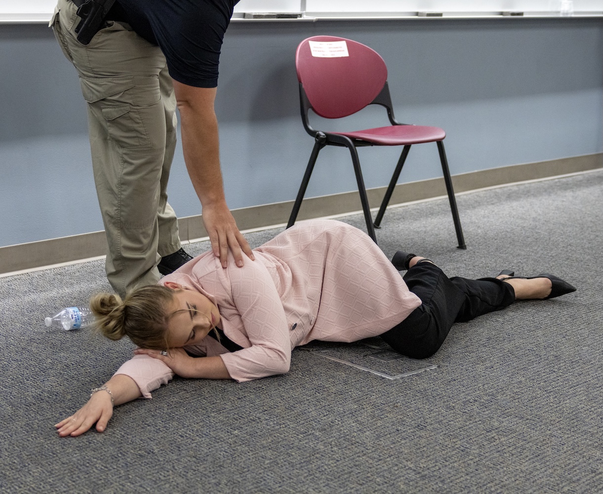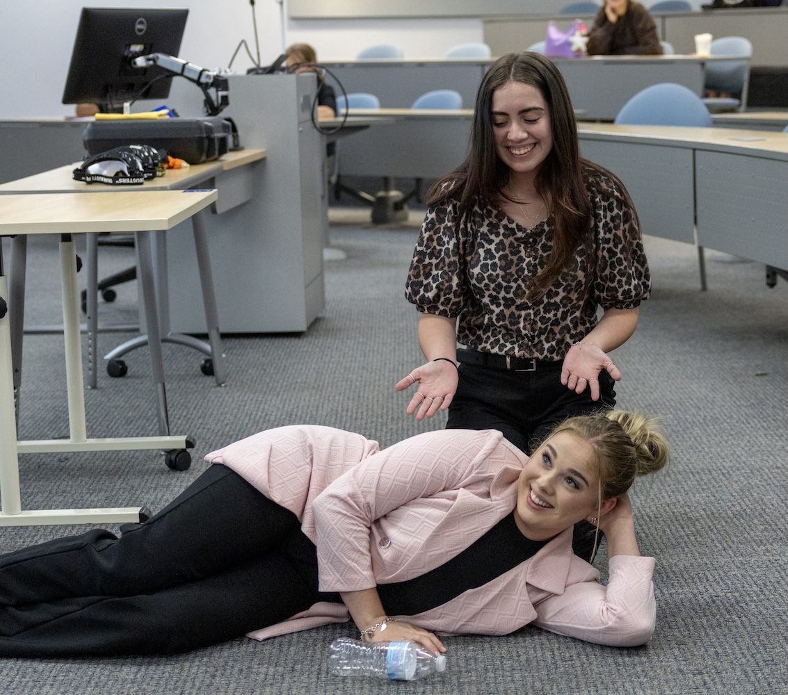 One of the most impactful moments came during a scenario involving someone who had clearly had too much to drink. The question wasn’t just “what’s illegal?” it was “what do you do in case of an emergency?” Students talked through what it means to take care of someone in that situation, from recognizing the signs of alcohol poisoning to physically placing someone in the correct position for safety. Our very own Brittlyn Jackson was eager to take the role of the incapacitated person, which she took on with uncanny verisimilitude!