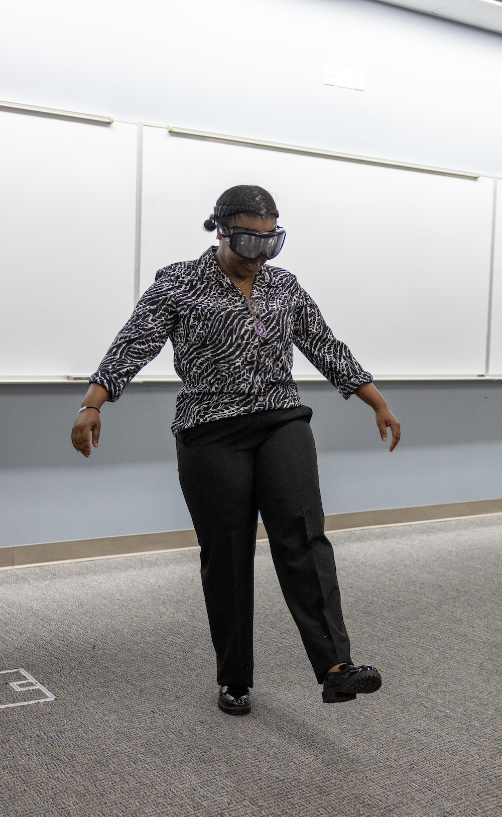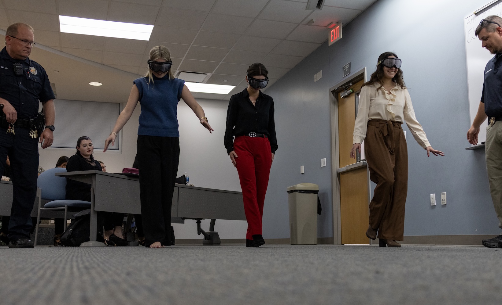 To best simulate the experience, various students put on goggles that distort vision, and for some, balance and coordination. As the students made their best attempts to “pass” the test, several good questions about their careers, hypotheticals, and explanations about the process occurred. It was quite fun to watch the students struggle to catch an eraser, walk in a straight line, or stand on one foot. Of course, we discourage any student from drinking and driving, but we would like to note that, based on their performances with drunk goggles, this would be particularly disastrous for Eva Killande rand La’Kia Tilley.