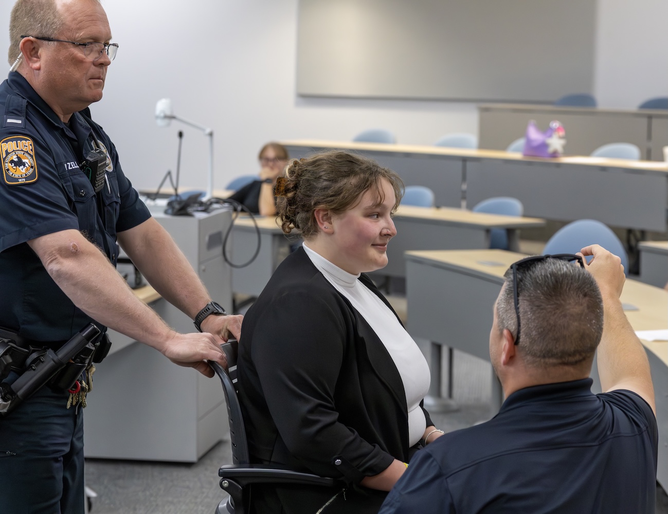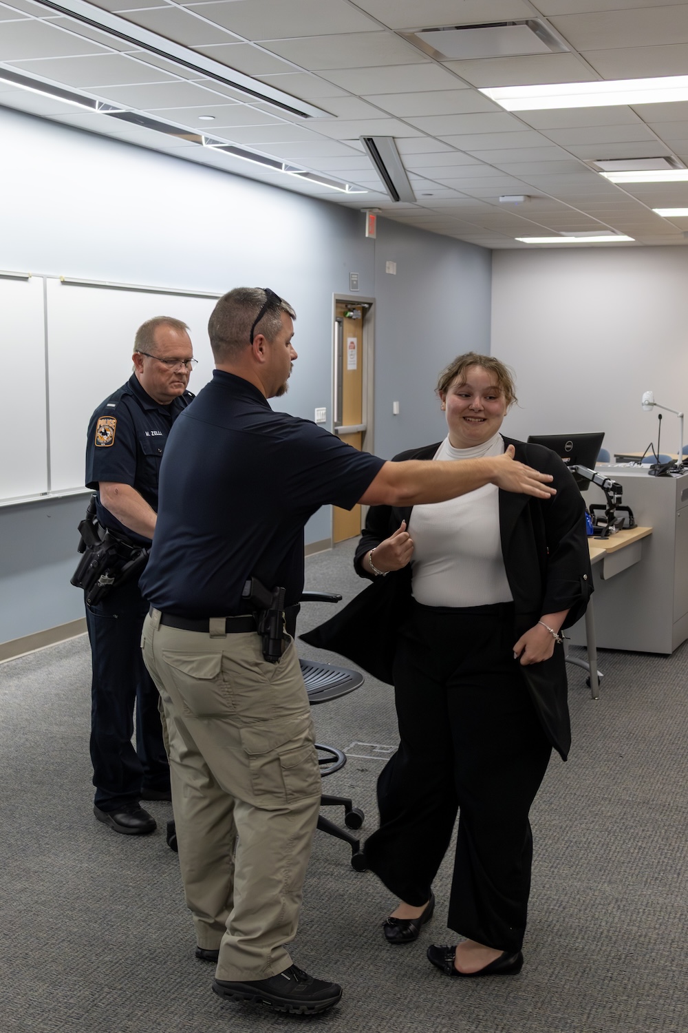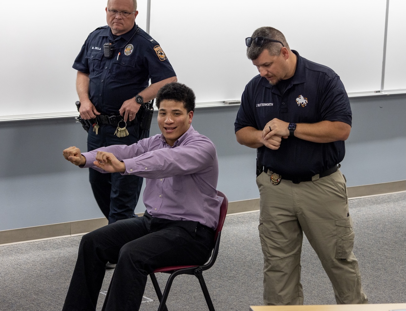 The next scenario played out involved a traffic stop with the potential for DWI and DUI. Gabriel Kranz-Danet played our “drunk driver,” and we learned about the best ways to pull over safely and swiftly. Unfortunately for Gabriel, his almost immediate confession brought this scenario to a quick conclusion!
