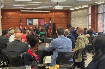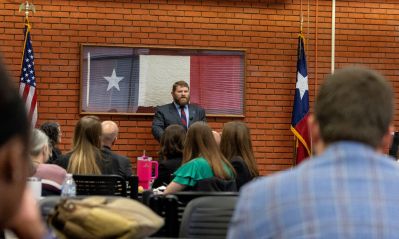 One of the advantages of attending SHSU is the opportunities afforded by the College of Criminal Justice, whose activities continue deep into the semester and even the summer. And so it was we found ourselves at lunch with 74 professionals from the legal and corrections community across the state of Texas–while listening to Texas Supreme Court Justice James Sullivan.