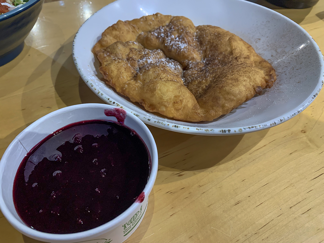 We tried a variety of dishes and did some sharing, hoping to get sampling of their entire menu. Professor Yawn tried the Indian Fry Bread, stuffed with shredded Bison; Olivia opted for the chicken; and Chrissy explored the ground Bison; and we also ordered a bowl of Bison chili and, for desert, we tried Wojapi with Indian Fry Bread (with cinnamon and sugar, of course).