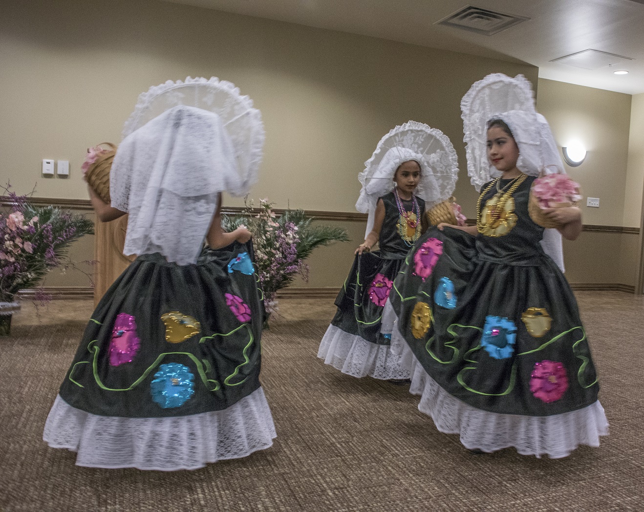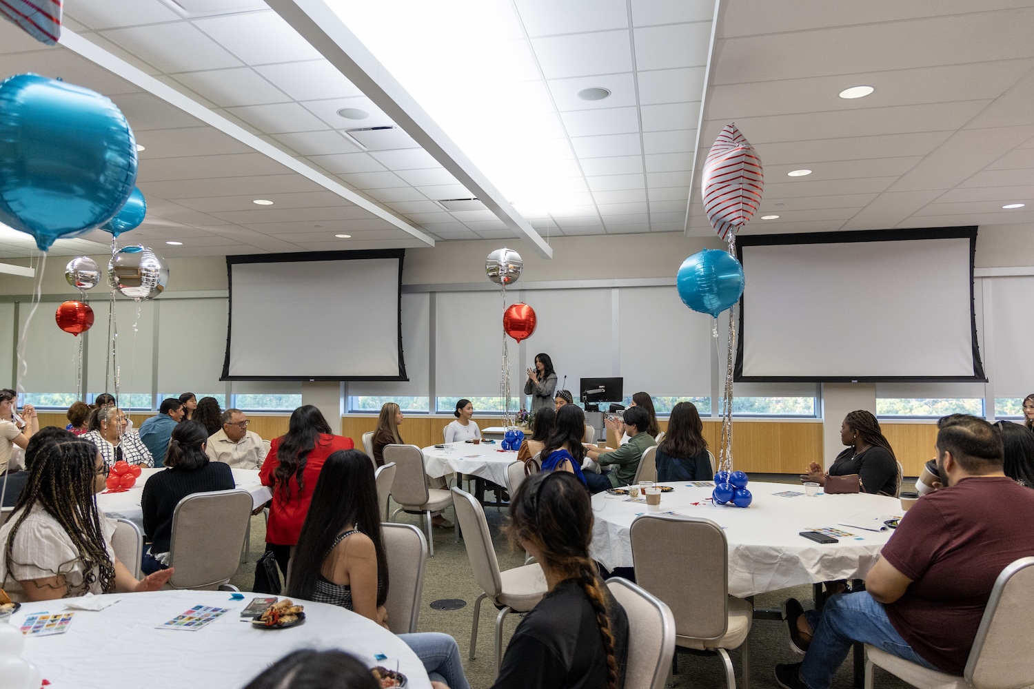 As guests arrived, they settled in with plates of delicious food–empanadas, beef satay, ceviche, and an array of other cultural dishes–setting the stage for an evening of culture and connections. The room itself was beautifully decorated with a patriotic theme symbolizing the civic pride and sense of belonging that come with citizenship.