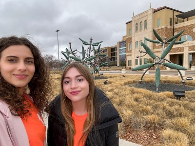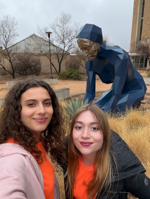 Olivia Discon and Chrissy Biello with Luis Jimenez’s “Mesteno” in Abilene