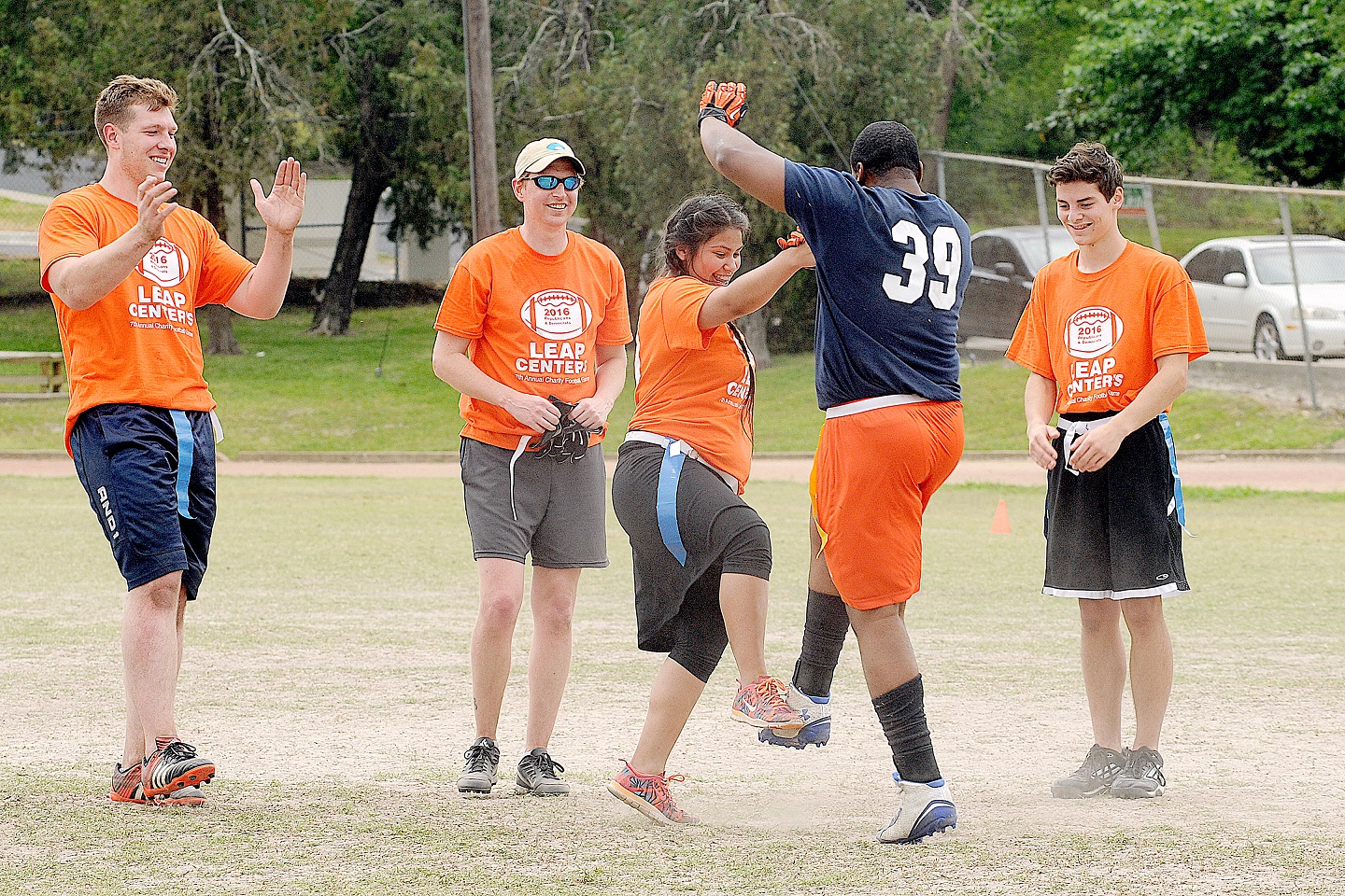 It was a bright, sunny Saturday, and the conditions were perfect for the LEAP Ambassadors. Almost all of the Ambassadors (except for Megan Chapa, who was still working hard in DC) took a break from the Austin Capitol and took back to Huntsville to volunteer in this great program. Bright and early, everyone showed up for set-up duty, which included rehearsing the YMCA dance, deciphering how to use the speakers and scoreboard, and lugging t-shirts and drinks.