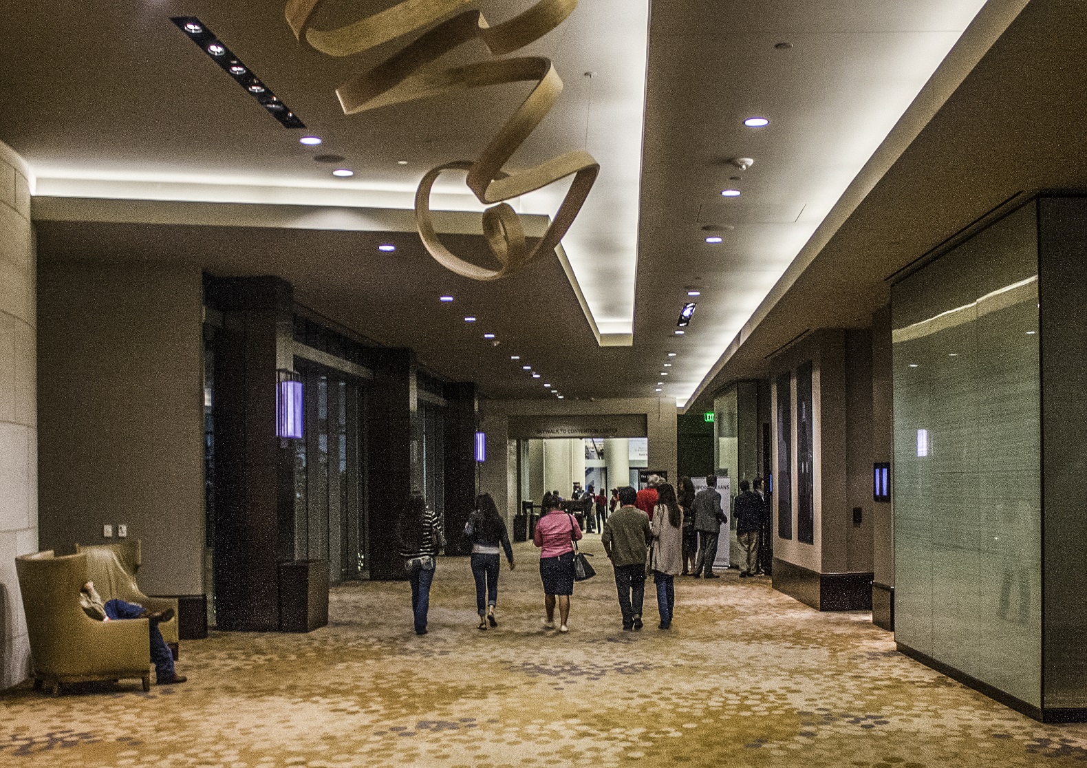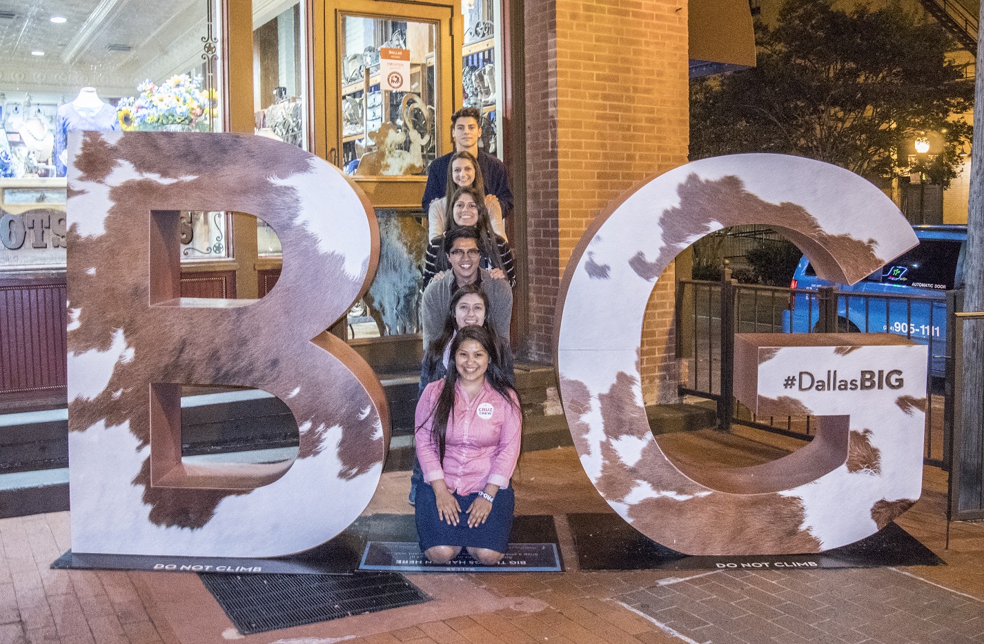 With dinner complete, we headed back to the Omni, hoping to walk off some of the food. On the way, we stopped at one of Dallas’s civic engagement spots: one of the Big D signs posted around town. Promoting the town logo of “The Big D”, the City has put up signs around town with a giant “B” and “G,” with a space in between. This space is designed to be filled by citizens, turning “i” into the City–Big D. And that’s what we did.