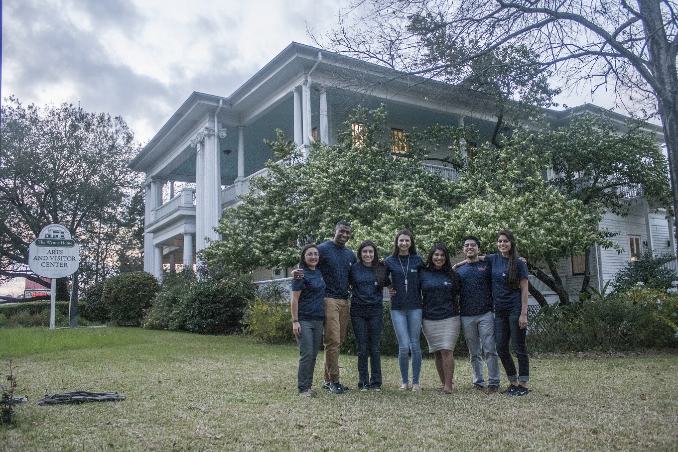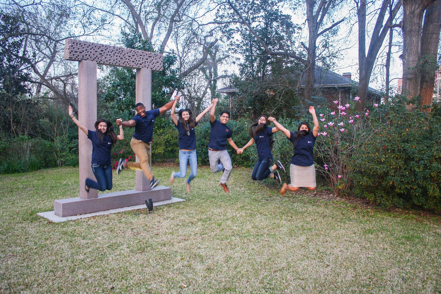 For each LEAP Day shot, we take a photo in a different spot, and this year was at the CHSS Water Wall. This is a nice spot, because the LEAP Ambassadors contributed financially to the creation of this space several years ago and because Jesus Moroles, the artist who created the space, is one of our favorite artists, as the photos from NW Arkansas, Houston, Lubbock, Birmingham, and Huntsville below attest: