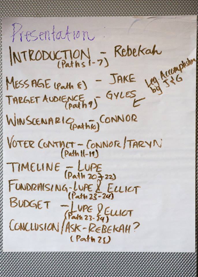 After this, we discussed strategy for outreach. One of the biggest takeaways from this event was that, as useful of a resource as social media is, it cannot replace the fundamental methods of voter/donor contact and outreach.