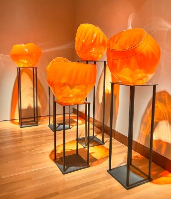 This allowed for the glass to shine in ways you couldn’t fathom. My favorite work, “Orange Baskets” won me over with the casted reflection of the light hitting the glass…