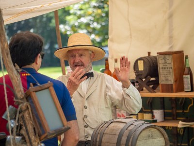 Tim Ross and Matt Phillips discussed the finer points of dueling “etiquette,” which involved the use of seconds/mediaries, how to extricate yourself from an impending duel, and the negotiations over the specifications of the duel (weapon choice, number of paces). Timed for exactly “high noon,” the duel took place in front of us; Ross and Phillips did a realistic enactment of the contest–without, of course, real bullets–taking their paces, aiming, and firing, and without hurting anyone.