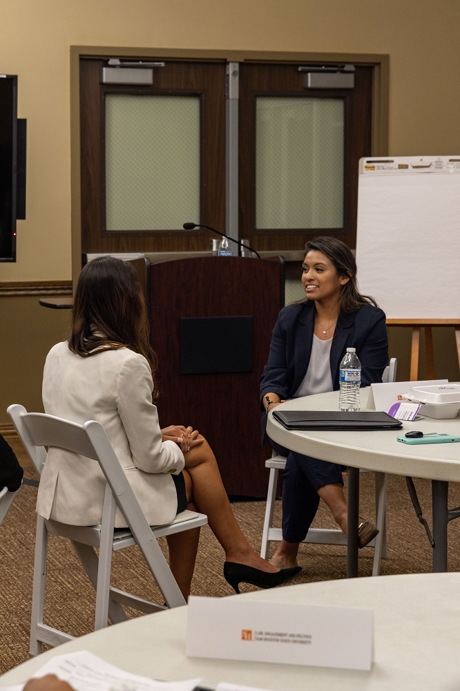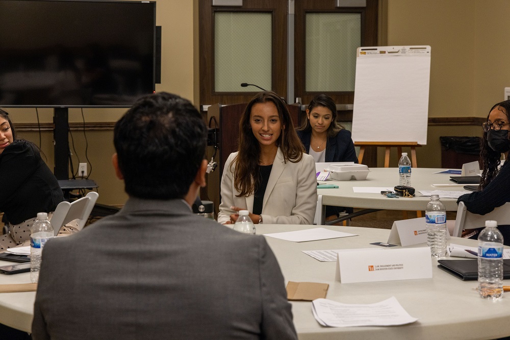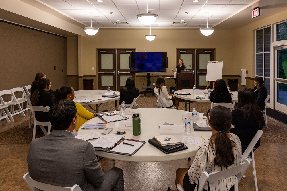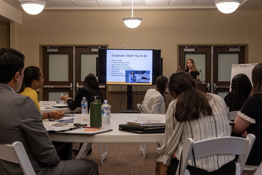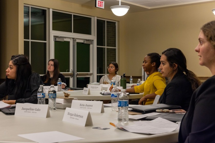 Instructed by Professor Yawn, a mock interview followed, including Yvette Mendoza as the interviewee and Catalina Padron as the interviewer. Starting as a one-on-one mock interview, we transitioned to a vigorous mock panel interview. Both students were able to showcase their newly learned skills. Unfazed by difficult questions, Yvette Mendoza kept her composure and conducted herself as a true professional. This example illustrates the initiative LEAP LEADs students are taking to expand their personal professional development.