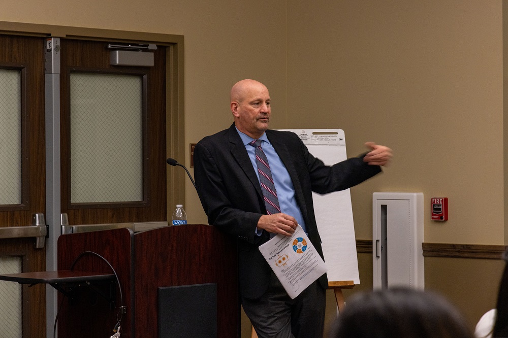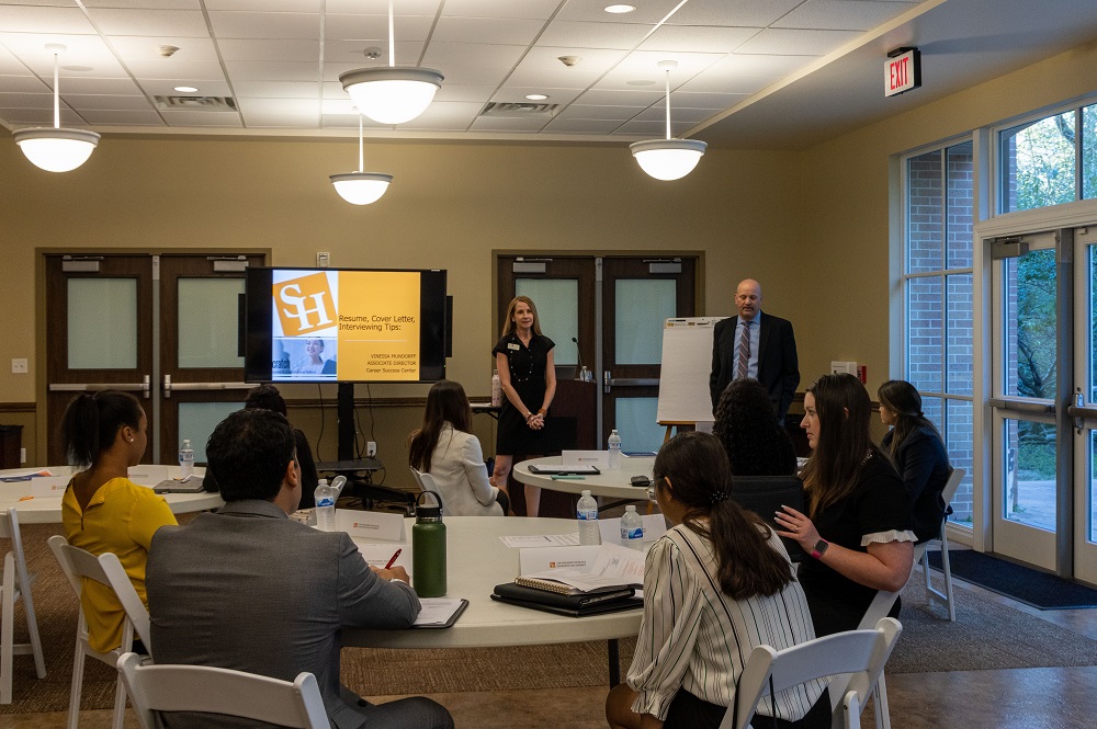 With our appetites satisfied, we turned our attention to applying the interview tactics Vinessa Mundorff covered in her presentation. In addition to the presentation, Professor Yawn outlined the different questions employers may ask and how to best prepare for them. Unbeknown to us, we were going to be tested on our newly taught information.