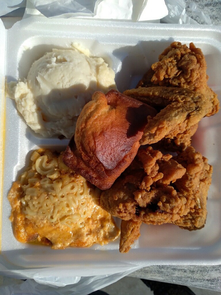 We ordered an assortment of items including fried chicken, neck bone, fried fish, macaroni & cheese, green beans, candied yams, and black-eyed peas.