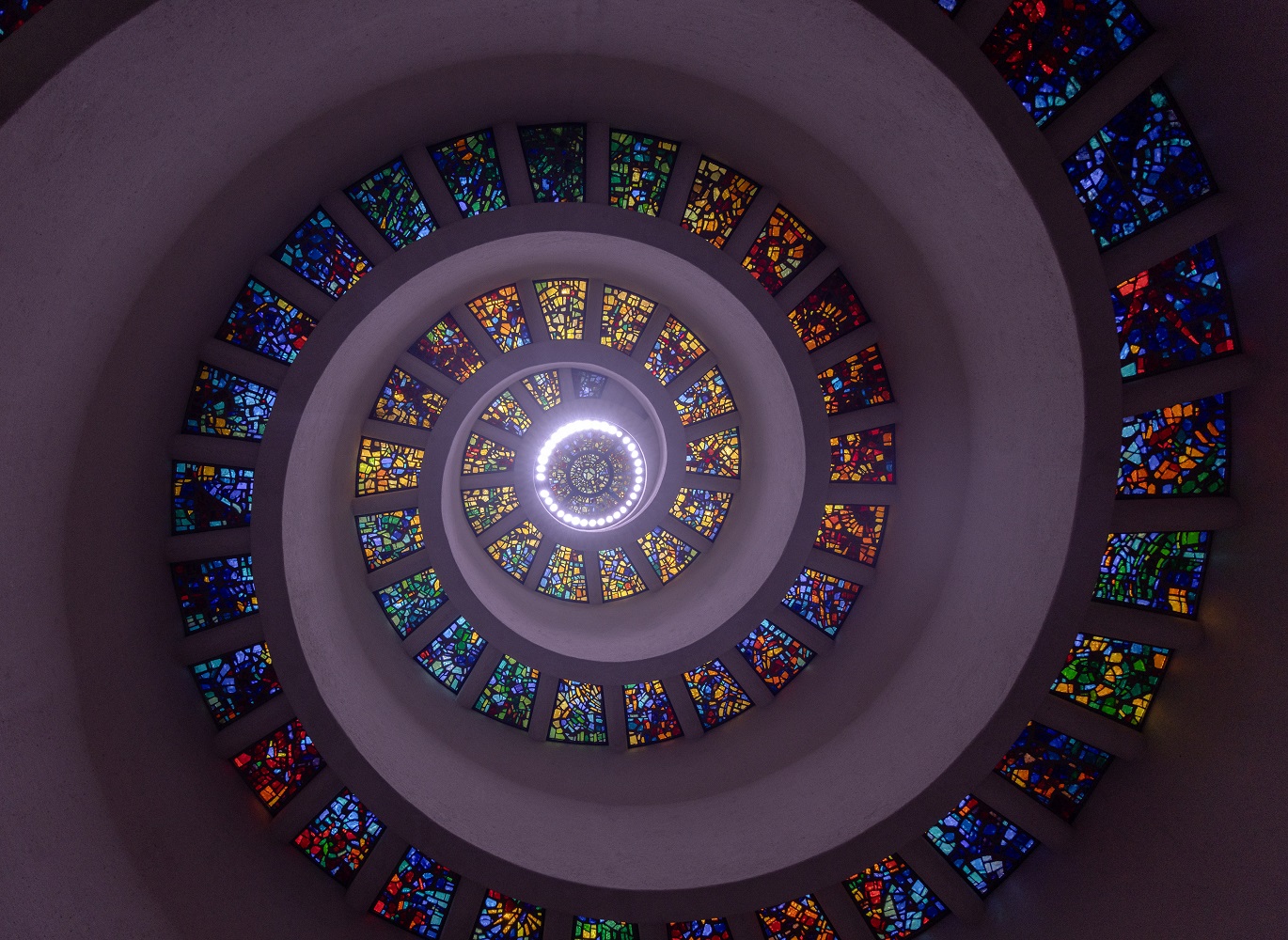 The spiral design, and the beautiful stained glass capture the “infinite upward reach of the human spirit”.