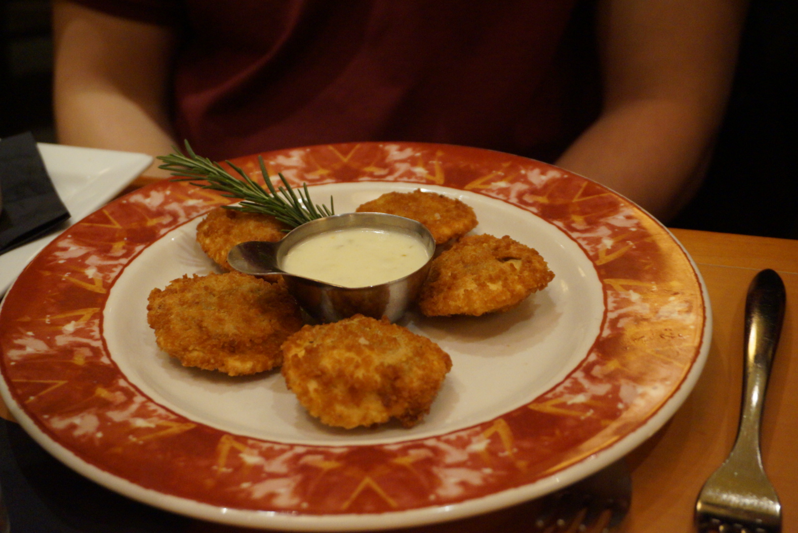 …though we did try some seafood as well for a little bit of variety. Our meal took an adventurous route for those of us who tried oysters for the first time before our entrees arrived. The mushroom stuffed chicken, ribeye steak, bacon avocado burger, bacon wrapped shrimp, mushroom stuffed ravioli, and flat bread all looked appetizing when they arrived at our table (and they tasted as great as they looked!).